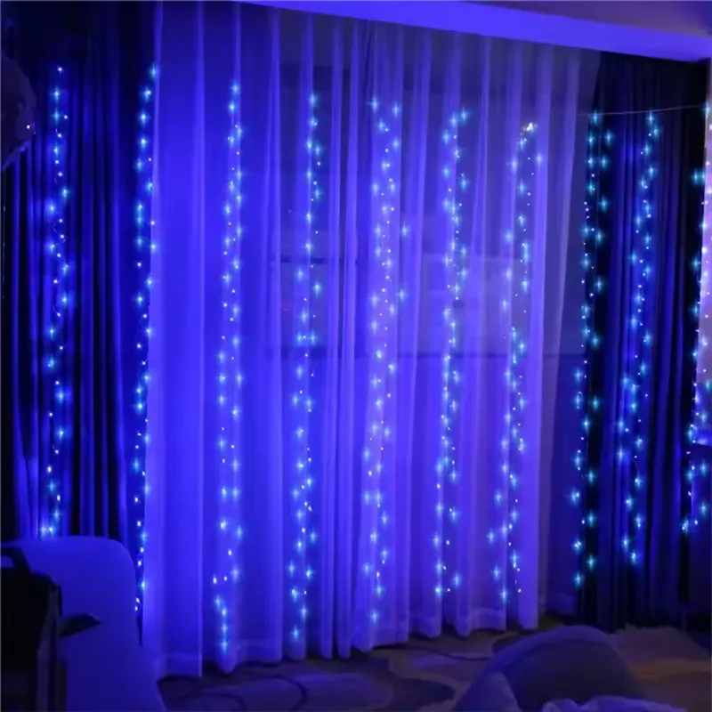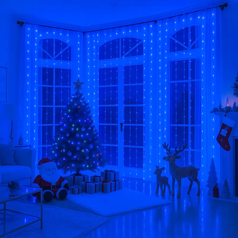 Zavesa od plavih LED sijalica donosi prefinjenu estetiku koja se lako uklapa u svaku dekoraciju. Pruža prijatno i smirujuće svetlo koje stvara atmosferu mira i elegancije.